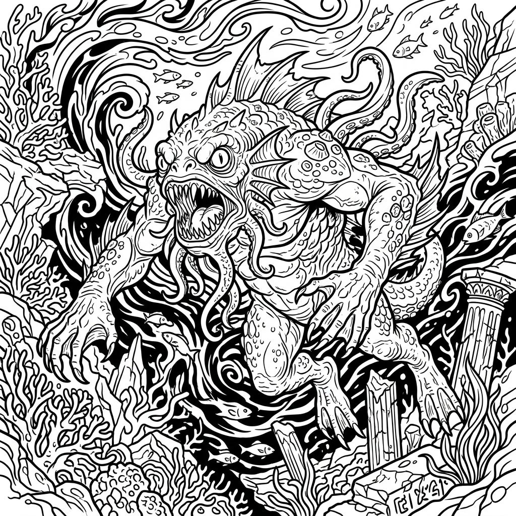 Embark on an epic coloring journey into the abyss with this captivating Eldritch Deep One coloring page. This stunning design showcases a monstrous, fish-like entity from the Cthulhu Mythos, featuring grotesque scales, sharp claws, gaping maw filled with fangs, and sinuous tentacles that hint at its otherworldly nature. Swirling currents, intricate coral formations, small schools of fish, and the eerie remains of ancient sunken ruins create a dense, immersive backdrop, offering countless details to bring to life.