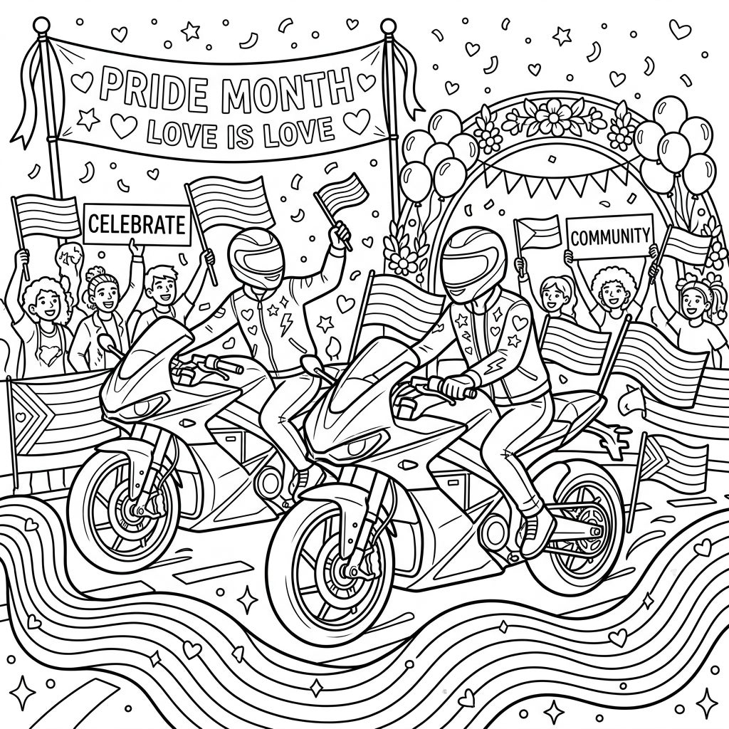 This coloring page beautifully captures the spirit of Pride Month, symbolizing love, acceptance, and the strength of community. The powerful presence of electric motorcycles adds a contemporary and forward-thinking twist to the traditional parade, blending innovation with celebration. It’s an invitation to reflect on the joy of self-expression and the importance of unity, all within a vibrant, festive atmosphere.