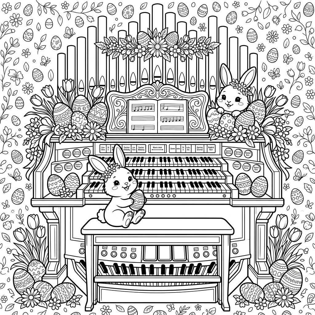 Immerse yourself in the joyful spirit of Easter with this delightful coloring page featuring an electronic organ adorned with playful bunnies and festive eggs. It's the perfect blend of music and spring celebration, ready for your artistic touch.