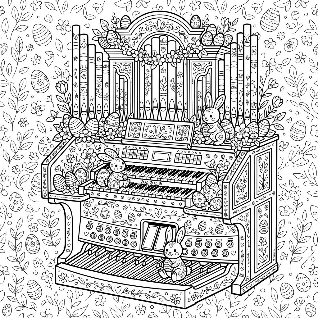 Immerse yourself in a festive scene combining the grandeur of an electronic organ with the cheerful spirit of Easter. This delightful coloring page features playful bunnies, intricately decorated eggs, and charming spring blossoms.