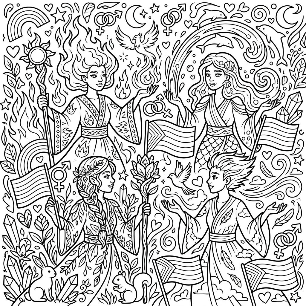 Beyond their elemental powers, these enchanting witches come together in a vibrant celebration of Pride Month. The entire scene is interwoven with symbols of love, diversity, and acceptance, including numerous Pride flags, graceful rainbow arcs, intertwined gender symbols, and heartfelt declarations. This page is a tribute to the beauty of individuality and the strength found in unity, offering a canvas to express your support and joy for the LGBTQ+ community. It’s more than just a coloring page; it's a statement of celebration and inclusion.