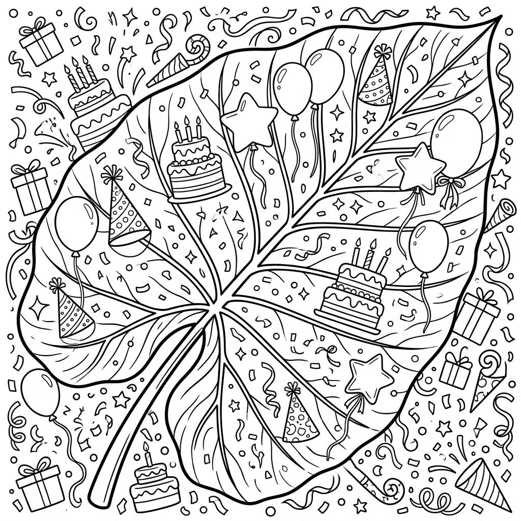Dive into a botanical birthday bash with this unique coloring page featuring a grand elephant ear leaf. Adorned with festive cakes, balloons, and confetti, it's a delightful way to celebrate any special day.