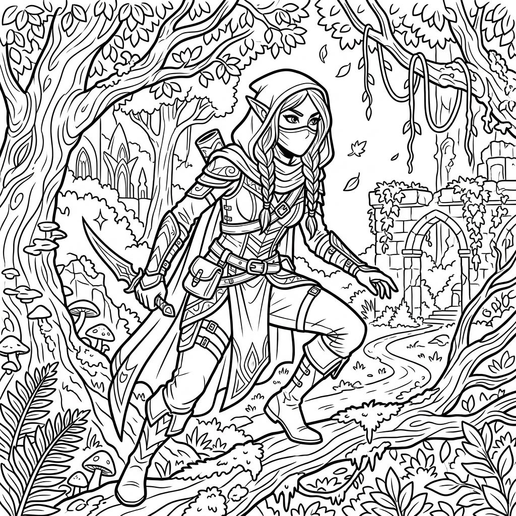 Step into a world of fantasy with this enthralling coloring template featuring a nimble Elven Rogue. Clad in intricate armor, a flowing cloak, and a mysterious mask, this agile character is poised for adventure, dagger in hand. The detailed design captures the essence of a seasoned scout or assassin, ready to navigate the enchanted forest where ancient ruins and gnarled trees create a captivating backdrop.