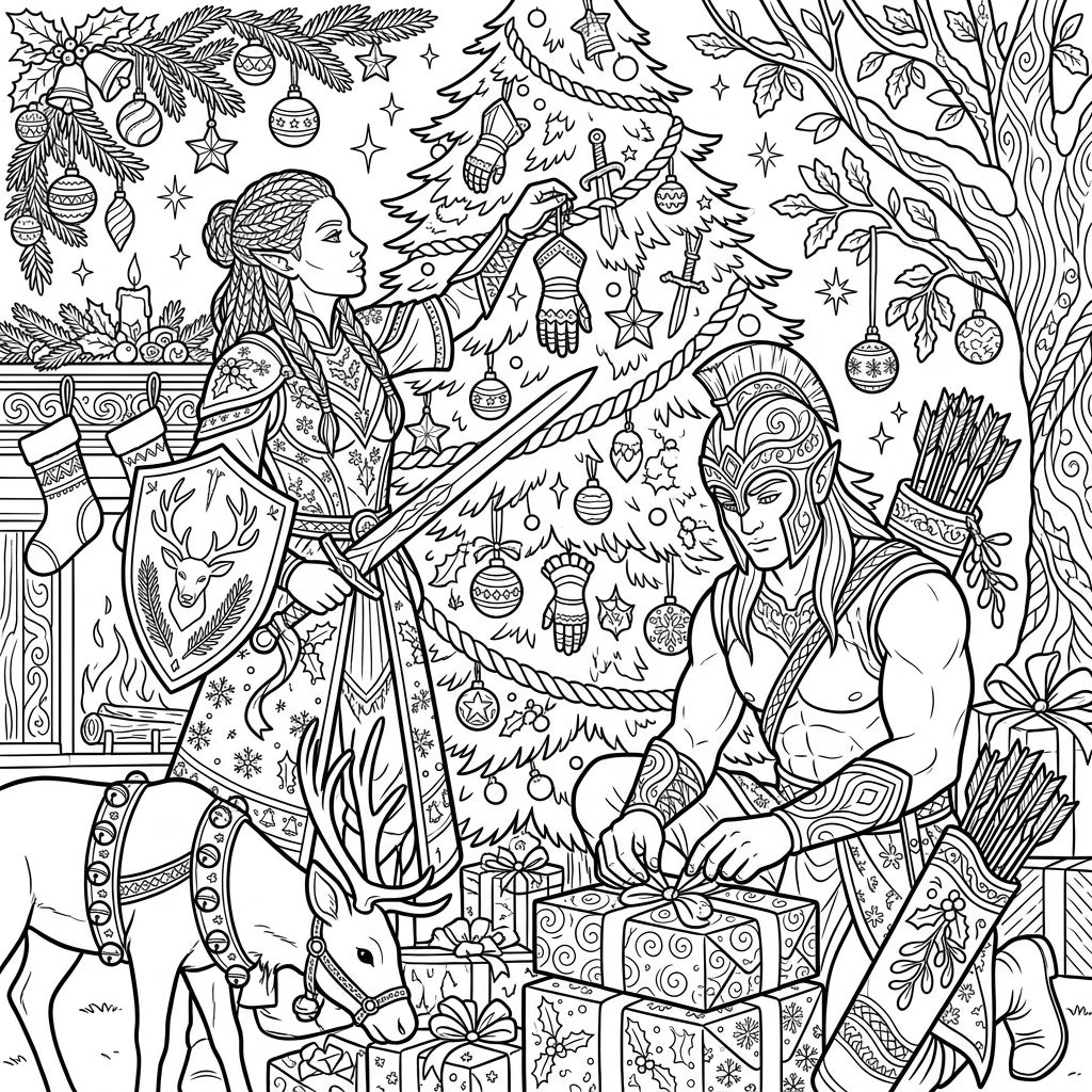 This exquisite coloring page transports you to a fantastical Christmas scene, where two majestic Elven Warriors pause from their noble duties to embrace the holiday spirit. On the left, a graceful female elf, adorned in elaborate warrior attire, wields a mighty sword and shield emblazoned with a deer emblem. She meticulously places a weapon-themed ornament on a beautifully decorated Christmas tree, surrounded by festive baubles and shimmering stars. Beside her, a gentle reindeer stands patiently, adding to the magical ambiance of this unique holiday tableau.