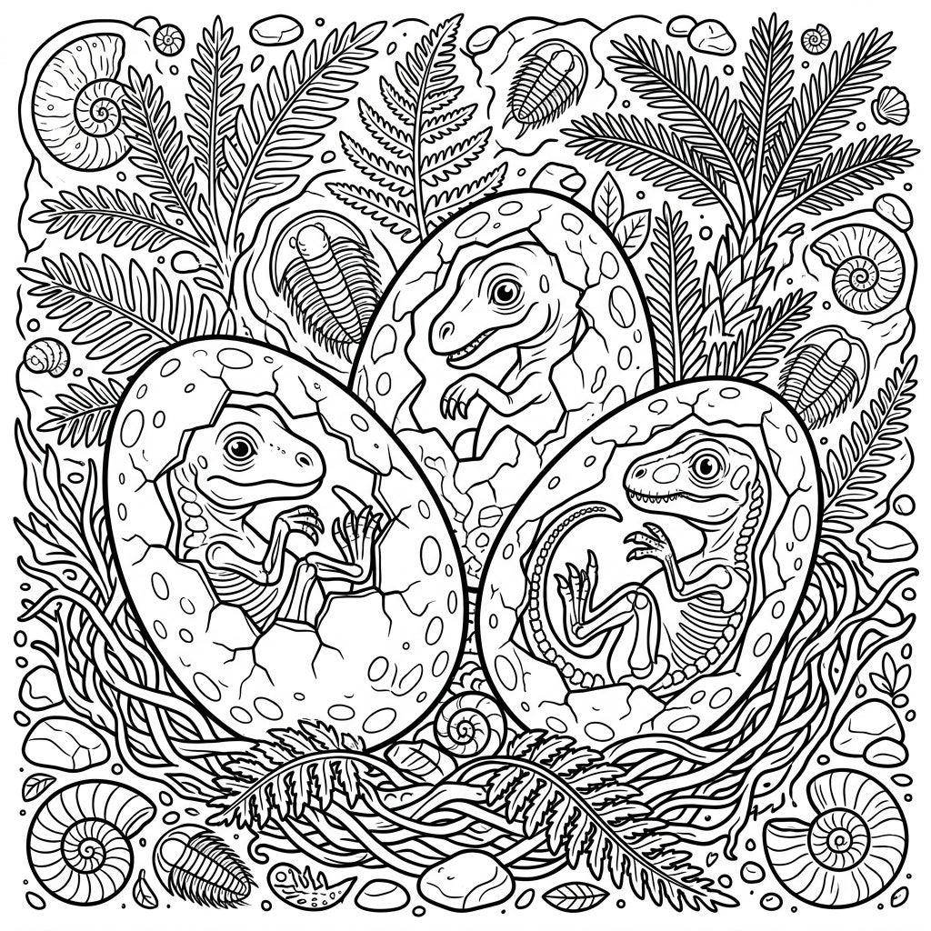 Dive into a fascinating prehistoric scene where three remarkable dinosaur eggs are on the verge of hatching. Each egg, intricately cracked, reveals the identifiable remains of a developing dinosaur embryo. One delicate hatchling is seen with detailed skeletal features, offering a glimpse into ancient anatomy, while the others are ready to emerge fully. They are nestled snugly in a bed of textured leaves and branches, surrounded by a rich tapestry of ancient flora and fossilized treasures like elegant fern fronds, swirling ammonite shells, and distinctive trilobites, ensuring a truly immersive coloring experience.