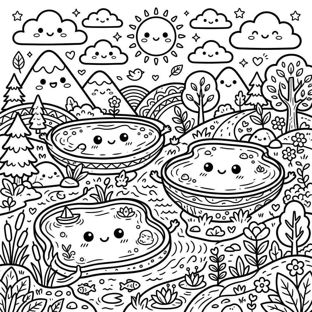 Unleash your creativity as you decide on the perfect palette for these cute endorheic lakes and their surroundings. Consider vibrant blues and greens for the water and foliage, pastel pinks and yellows for the sky and clouds, or even imaginative, fantastical colors to truly make this Kawaii world your own. Whether you use markers, colored pencils, or digital tools, this intricate yet approachable design offers endless opportunities to add your personal touch and bring this happy landscape to brilliant life.