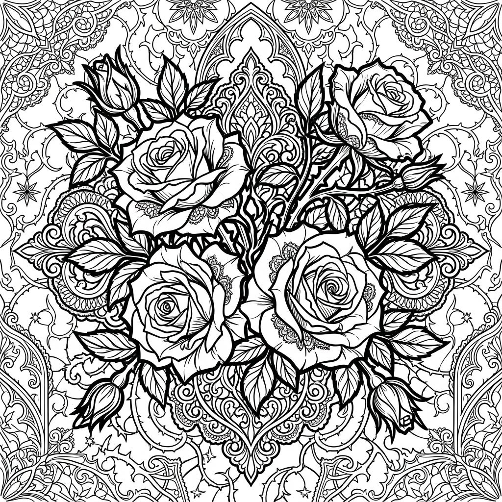 Explore a captivating coloring page featuring lush English roses intertwined with intricate Gothic patterns. This design offers a unique blend of natural beauty and dark romantic elegance, perfect for creative expression.