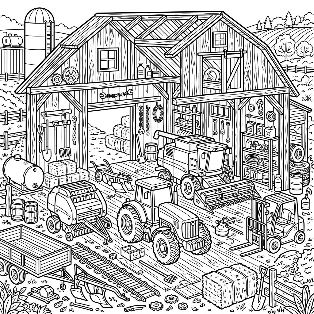Step onto a vibrant farm with this captivating coloring page that brings an equipment barn to life. This intricate illustration invites you to explore every corner of a busy farm storage, from the sturdy wooden planks of the barn itself to the powerful machinery housed within. Discover a formidable combine harvester, a classic tractor ready for the fields, a hay baler, and even a forklift, all rendered with fine lines and engaging details. Look closer to spot various farm tools hanging neatly, shelves stacked with supplies, and bales of hay, creating a rich tapestry of farm life.