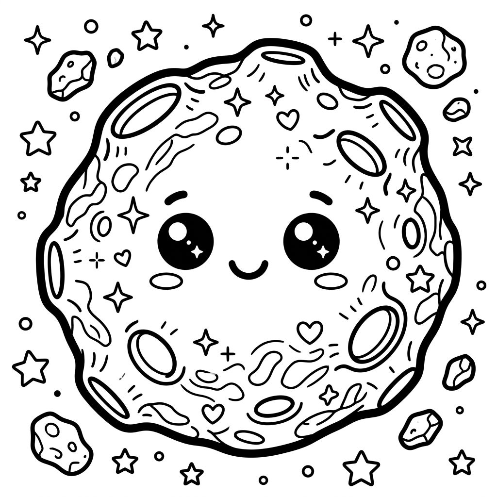 Discover the wonder of space with our unique Kawaii Eros Asteroid coloring template. This delightful illustration brings the famous Near-Earth asteroid to life with an irresistibly cute, smiling face, complete with large, sparkling eyes. Its chunky, rounded form is detailed with a variety of craters and textures, all rendered in the signature bold outlines of the kawaii style, making every feature pop out and inviting your artistic touch.