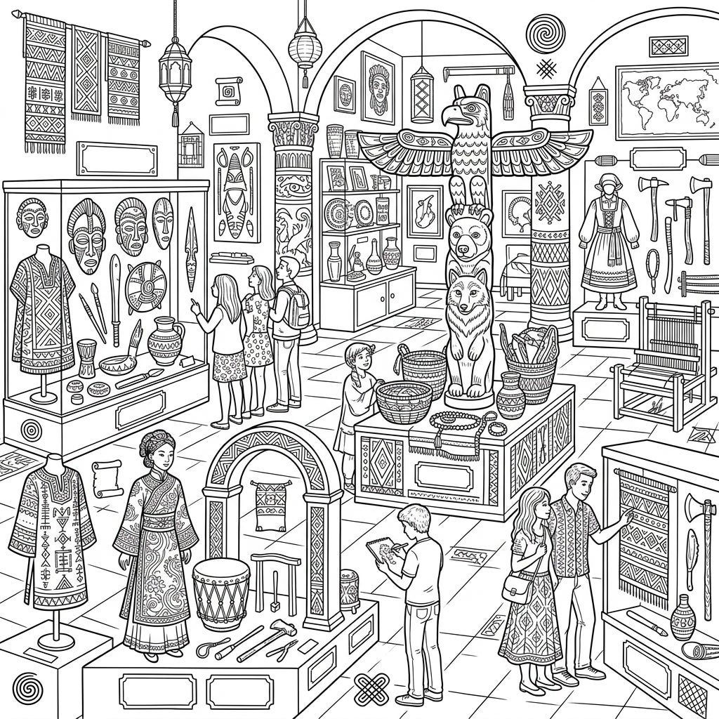 Embark on an artistic journey through history with this captivating ethnography museum coloring page, crafted especially for teens. Discover fascinating artifacts and intricate patterns from diverse global cultures, ready for your creative touch.