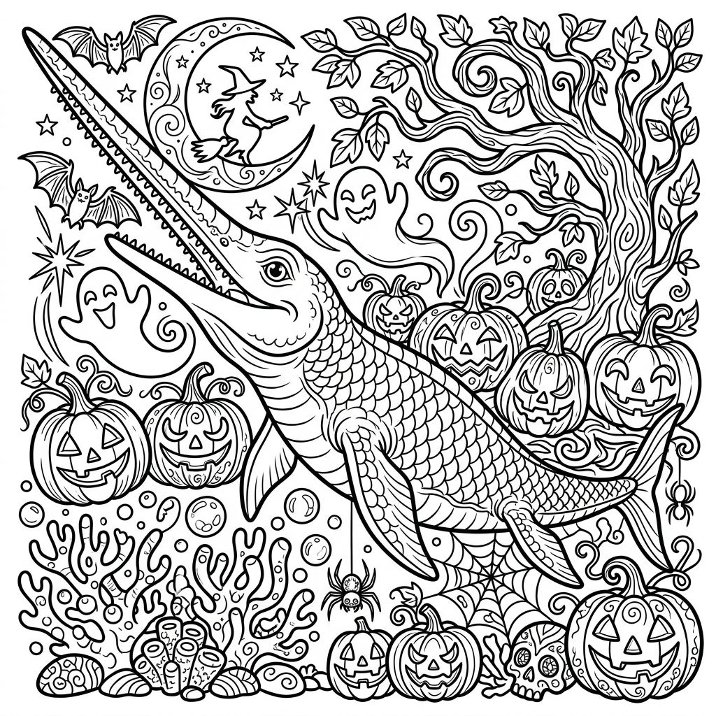 This unique coloring page masterfully blends the ancient mysteries of the ocean with the spirited fun of Halloween. It's a perfect fusion of natural history and seasonal cheer, creating a scene that is both educational and entertaining. The dense composition ensures there are no empty spaces, offering a rich tapestry of details to explore, from the patterns on the pumpkins to the texture of the gnarled tree branches and the intricate underwater flora. It's a celebration of imagination, where a creature from the distant past joins the spooky festivities of today.