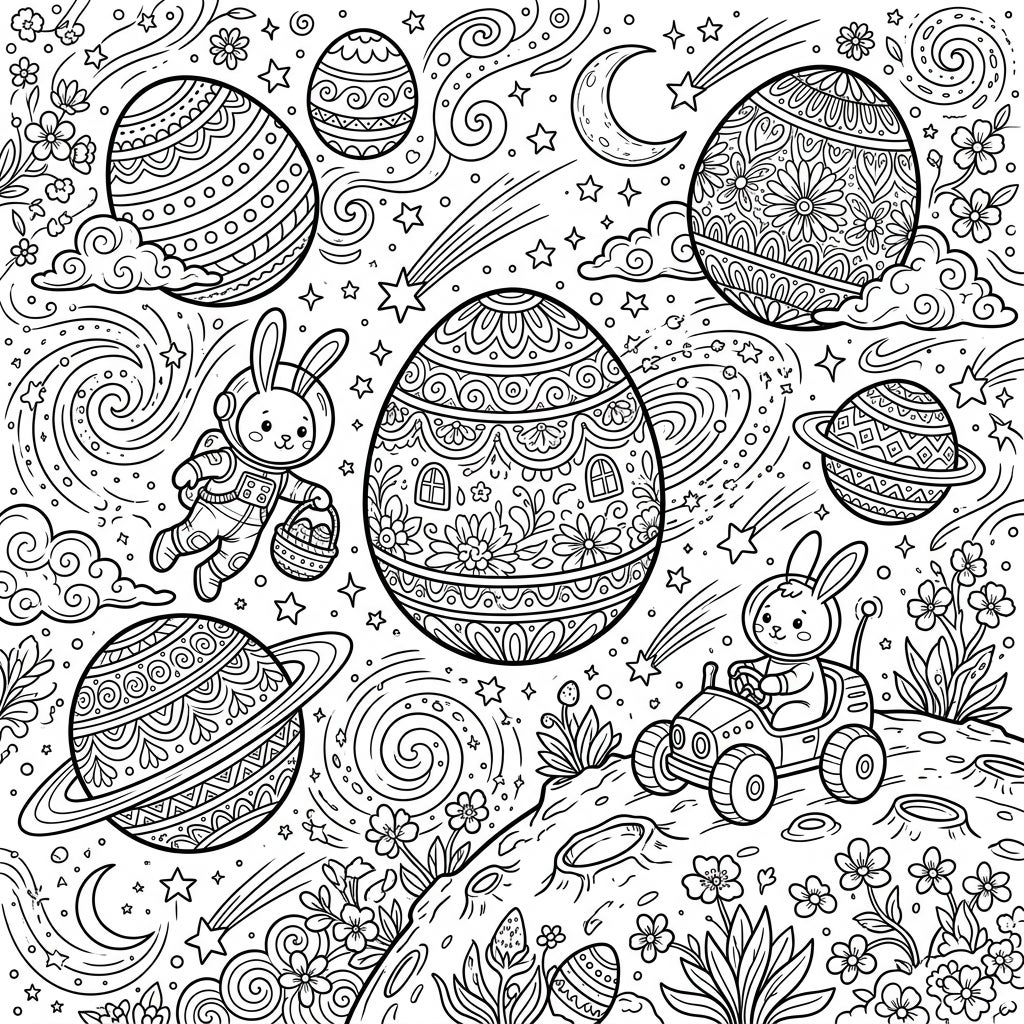 Embark on an out-of-this-world Easter journey with this detailed coloring page designed for teens. Discover a whimsical universe where astronaut bunnies explore exoplanets decorated like festive Easter eggs amidst a cosmic landscape.