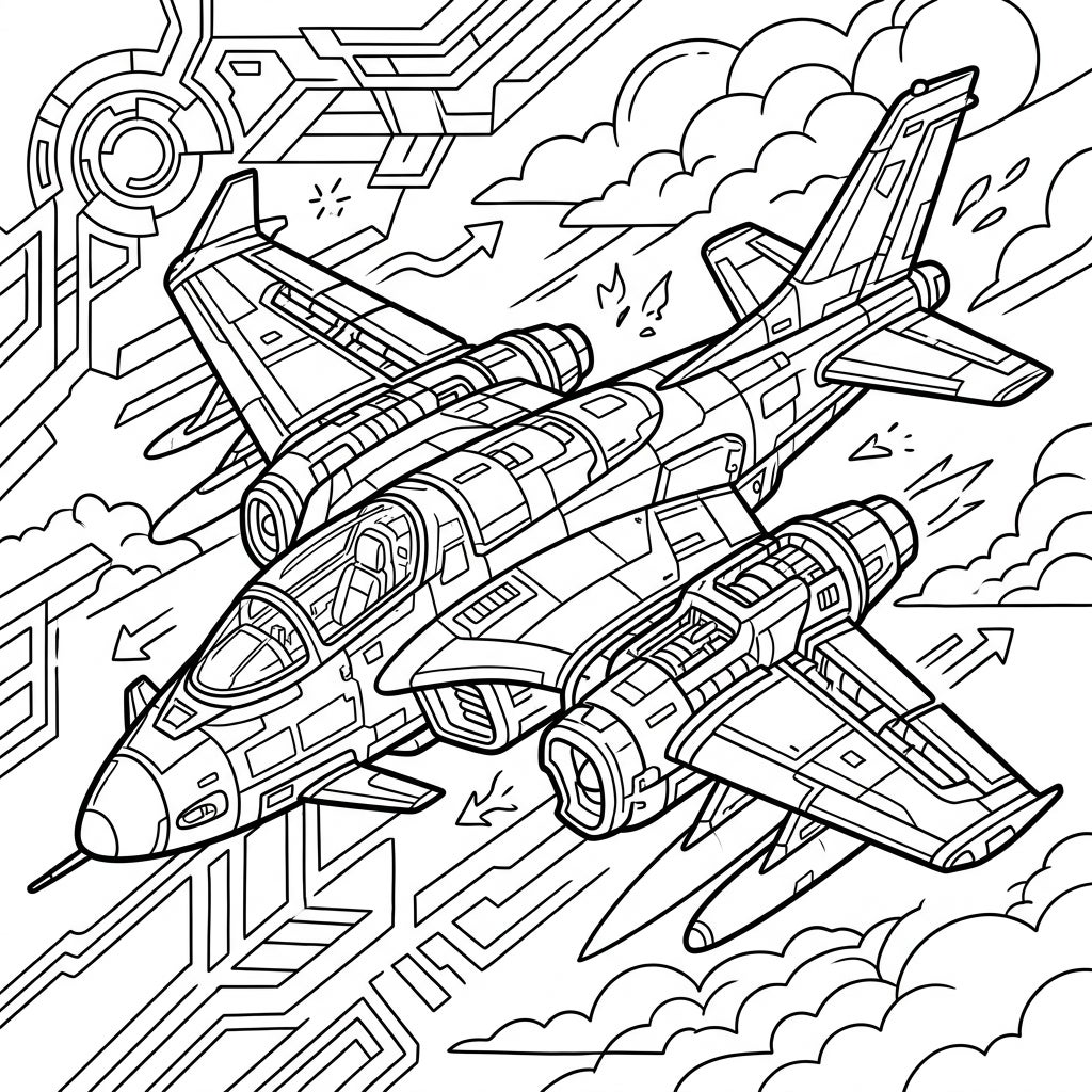 Dive into the intricate world of aerospace engineering with this captivating experimental aircraft coloring page. The central focus is a marvel of design, showcasing an advanced flying machine with multiple powerful engines, sleek aerodynamic contours, and a detailed cockpit. Surrounding this magnificent jet, you'll find dynamic abstract technical patterns and gentle cloud formations, creating a sense of rapid movement and futuristic exploration. Every line invites you to add depth and dimension to this high-tech marvel.
