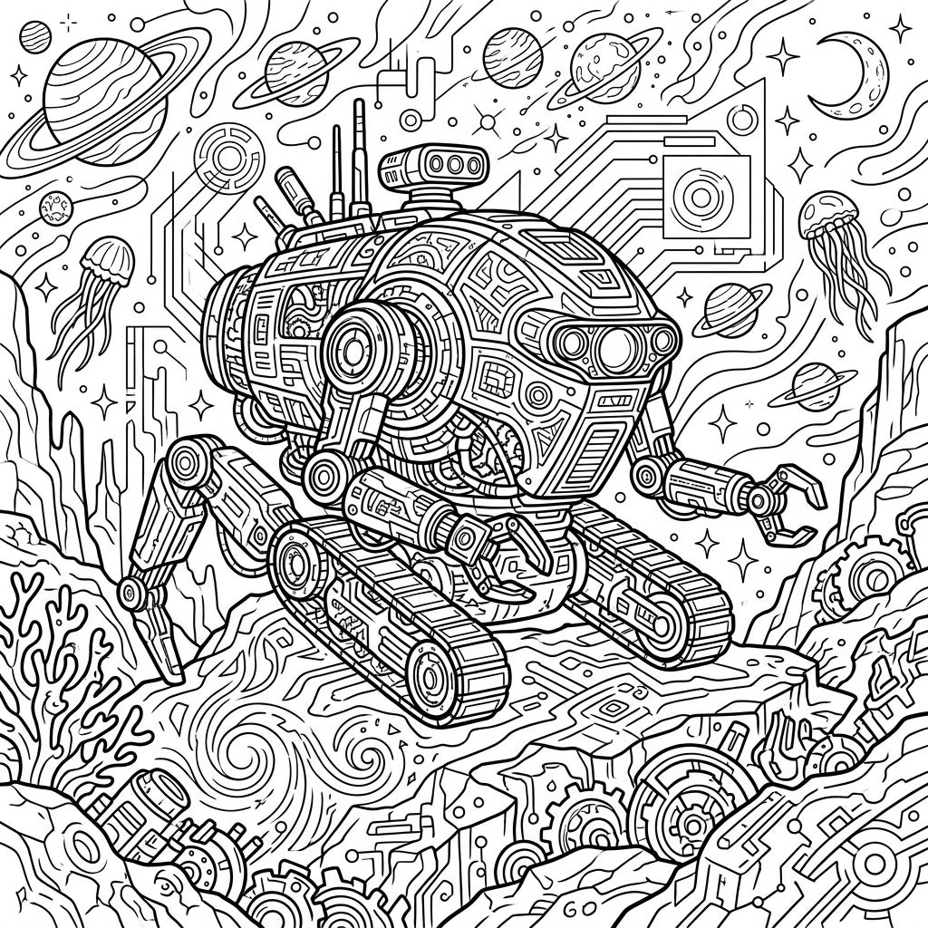 Dive into a meticulously crafted universe with our 'Exploration Robot' adult coloring page. This design features a highly sophisticated robot, equipped with robust tank treads and an articulated mechanical arm, ready to traverse unknown terrains. Its body is adorned with incredibly intricate patterns and visible internal components, promising a challenging yet rewarding coloring experience. The rich background seamlessly blends cosmic elements like ringed planets and distant stars with mysterious deep-sea formations and ethereal jellyfish, all interwoven with futuristic circuit board designs, ensuring every inch of the page offers a new detail to discover.