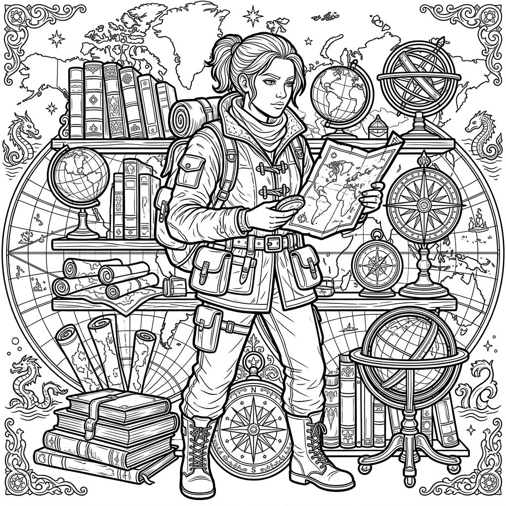 Step into a world of adventure with this captivating explorer coloring page, perfect for anyone fascinated by discovery and uncharted territories. This intricate design features a courageous navigator surrounded by vintage maps, globes, and ancient tools, ready to inspire your creative journey.