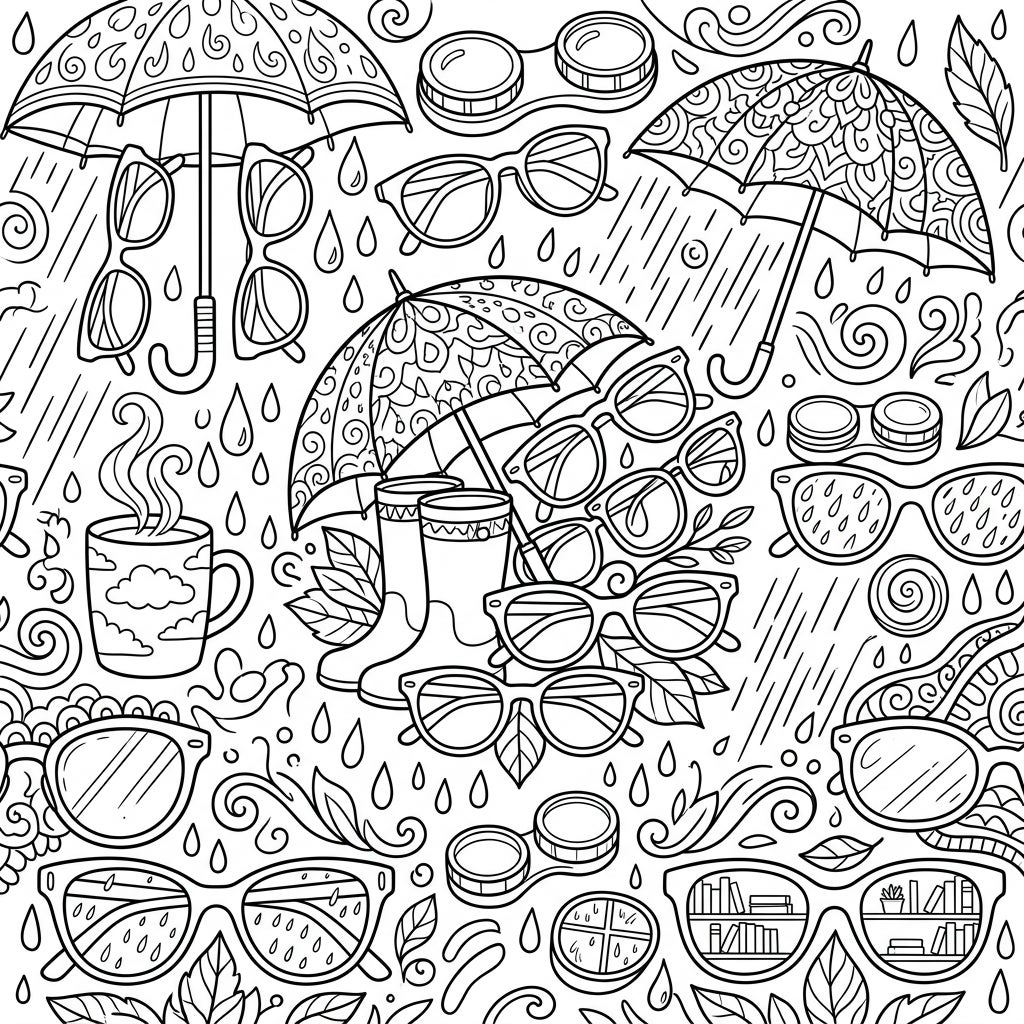 Dive into a charming scene where stylish eyewear meets the comforting embrace of a rainy day. This intricate coloring page features fashionable glasses, cozy umbrellas, and hints of indoor warmth, offering a delightful escape for your creative mind.