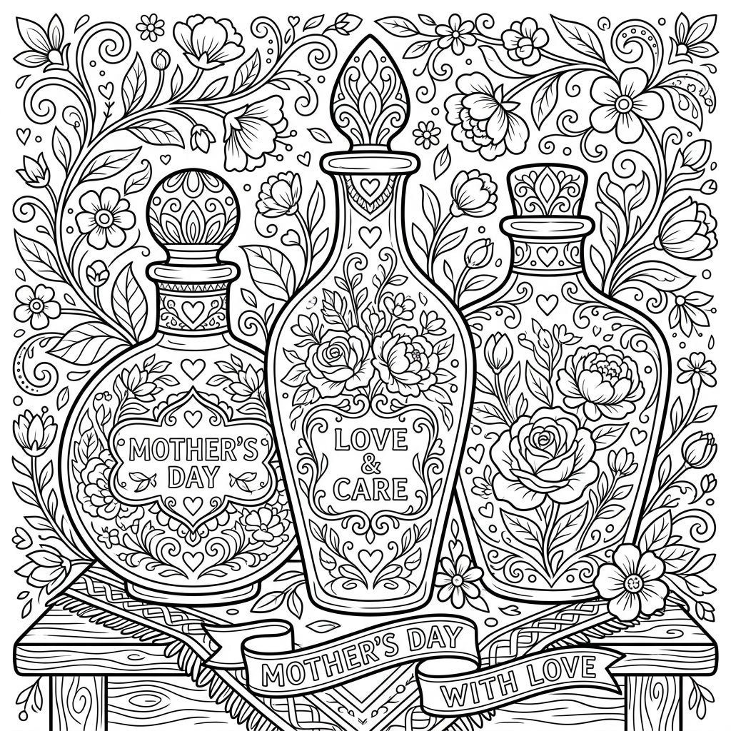 This beautiful Mother's Day coloring page features elegant facial oil bottles adorned with blooming flowers and heartfelt messages. It's a perfect way to show appreciation and relax with a creative activity for mom.