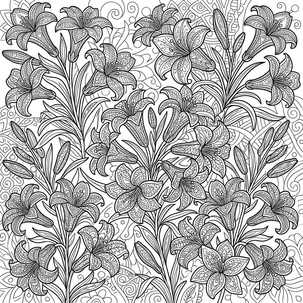 Step into a world where nature's delicate beauty meets intricate artistry with our Zentangle Fairy Lilies coloring page. This captivating design showcases an abundance of charming fairy lilies, known for their elegant trumpet-shaped blooms, all meticulously adorned with complex Zentangle patterns. Each petal and leaf is a canvas for swirling lines, dots, and abstract motifs, promising a deeply engaging and satisfying coloring experience.