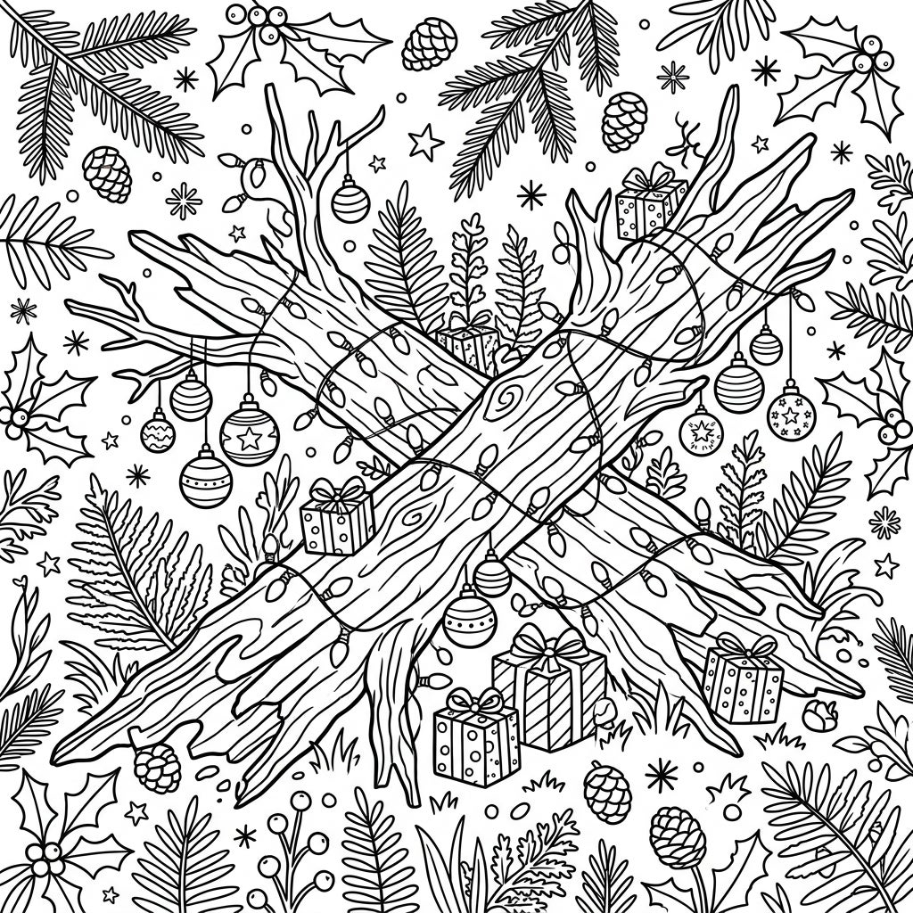 Discover the charm of nature meeting festive cheer with this unique Christmas coloring page. Intricate details of decorated fallen logs surrounded by holiday elements await your artistic touch.