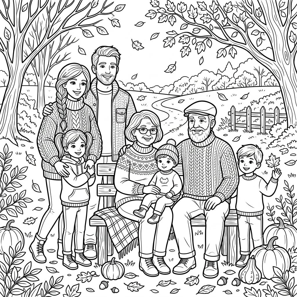 Celebrate the joy of family and the beauty of autumn with this heartwarming coloring page. Featuring a multi-generational family in cozy sweaters amidst fall foliage, it's perfect for all ages to enjoy.