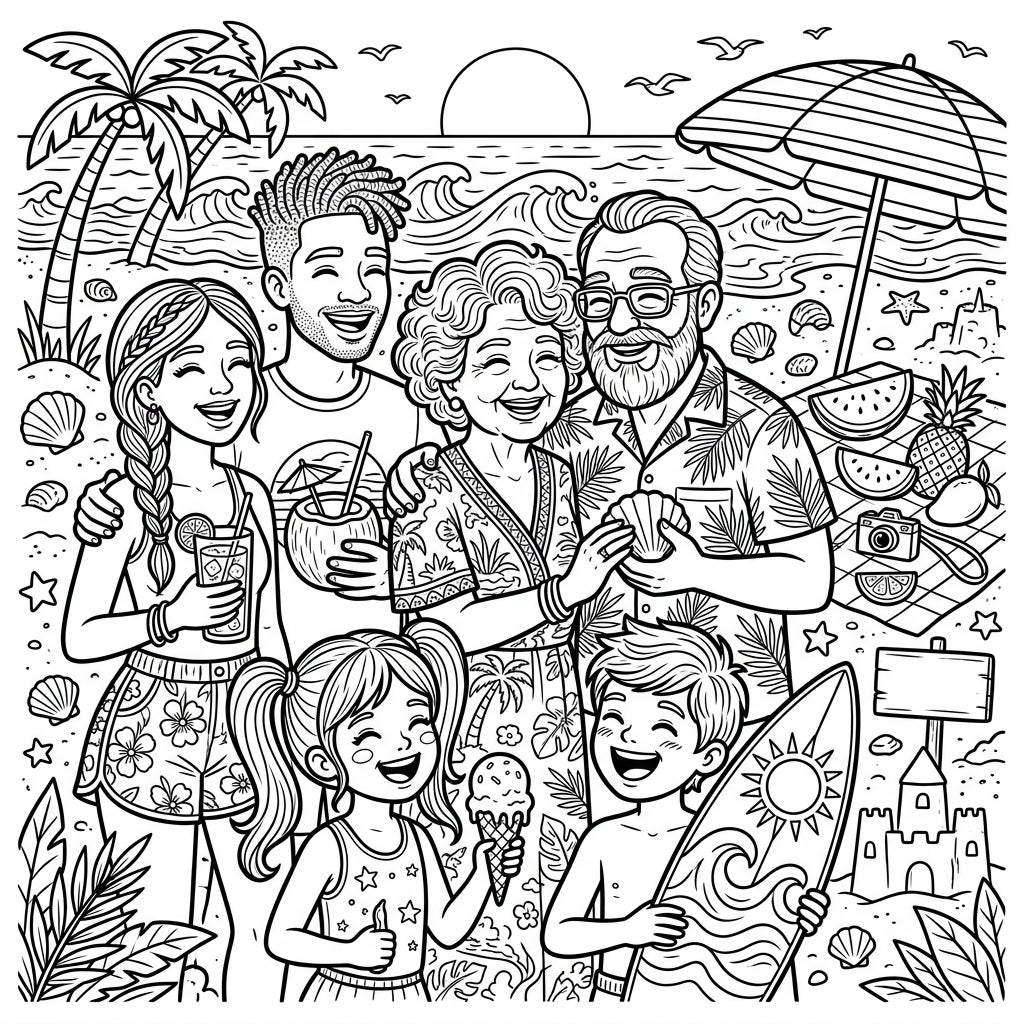 Immerse yourself in this wonderfully detailed coloring page featuring a multi-generational family enjoying a perfect summer day at the beach. From smiling grandparents and parents to happy children with ice cream and a surfboard, every member radiates joy. The background is rich with classic beach elements: swaying palm trees, rolling ocean waves under a bright sun, a cozy beach umbrella, and a charming sandcastle in progress. Look closely to find delightful details like scattered seashells, refreshing tropical fruits, and even a camera ready to capture memories.