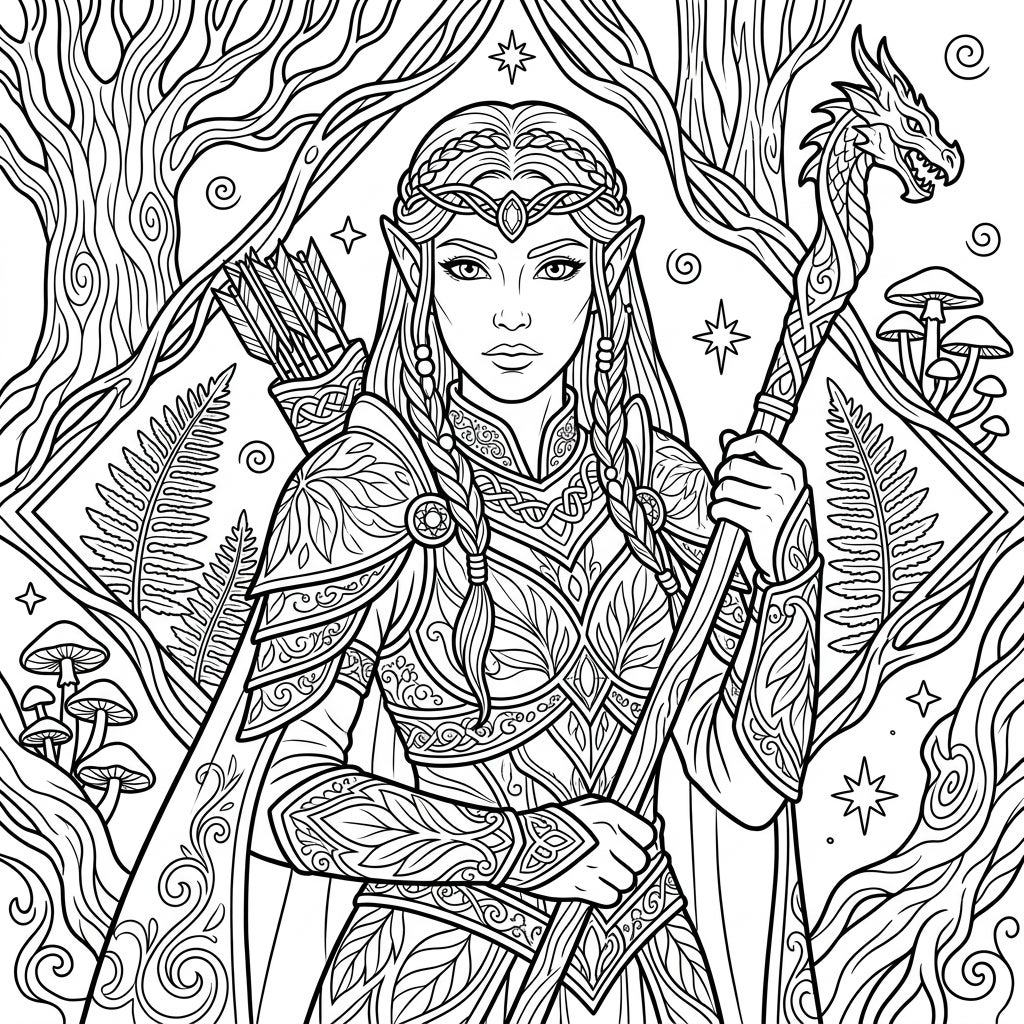 Delve into the enchanting world of fantasy with this exquisitely detailed adult coloring page. At its heart stands a majestic female elf warrior, adorned in an elaborate suit of armor featuring delicate leaf-like patterns and Celtic-inspired knots. Her long, braided hair cascades around her pointed ears, and a regal circlet rests on her brow, emphasizing her noble bearing. She firmly grasps a staff crowned with a fierce dragon's head, ready for adventure, with a quiver of arrows securely fastened to her back, hinting at her prowess as an archer.