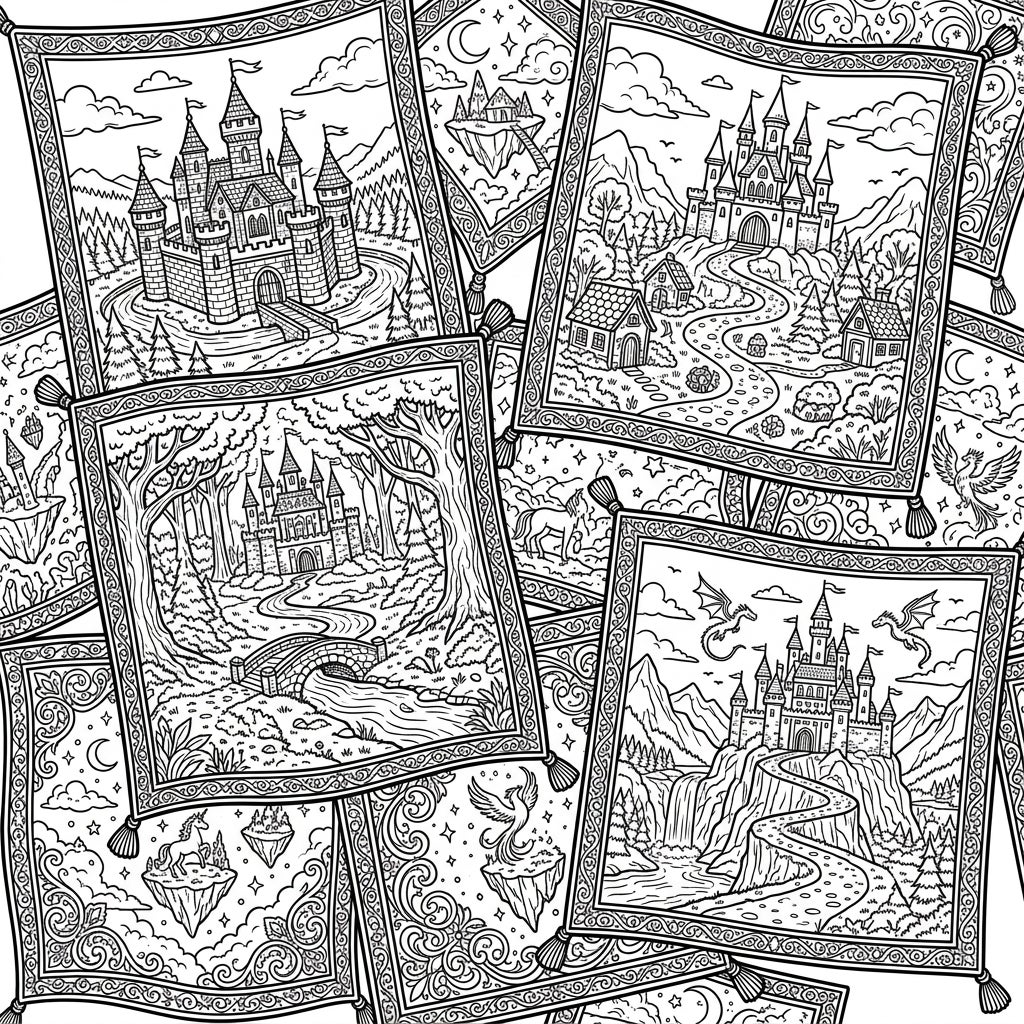 Prepare to be swept away on a whimsical journey with this magnificent collection of fantasy landscape coloring pages. Each design is uniquely presented on an ornate magic carpet, intricately detailed with borders and tassels. Discover diverse enchanted realms, from towering castles nestled among snow-capped mountains and winding rivers, to ancient forests hiding mystical bridges, and serene floating islands where unicorns and phoenixes roam. Every scene is rich with visual storytelling, inviting you to delve into a world where magic is real.