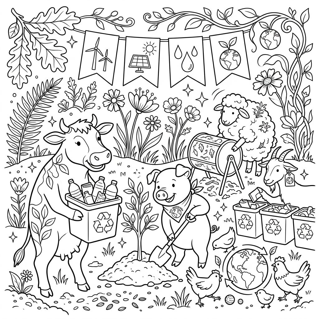 Step into a vibrant scene where the beloved farm animals become eco-heroes for Earth Day! This intricate coloring page showcases a friendly cow diligently holding a recycling bin filled with plastic bottles, while a cheerful pig gets its hooves dirty, planting a young tree. A fluffy sheep is hard at work turning a compost bin, and a wise goat sorts through recyclables, demonstrating responsible waste management. Surrounding these industrious creatures, you'll find happy chickens and chicks, alongside symbols of a healthier planet like a recycling Earth icon, all set amidst lush foliage and blooming flowers, with festive banners celebrating renewable energy sources like wind and solar power.