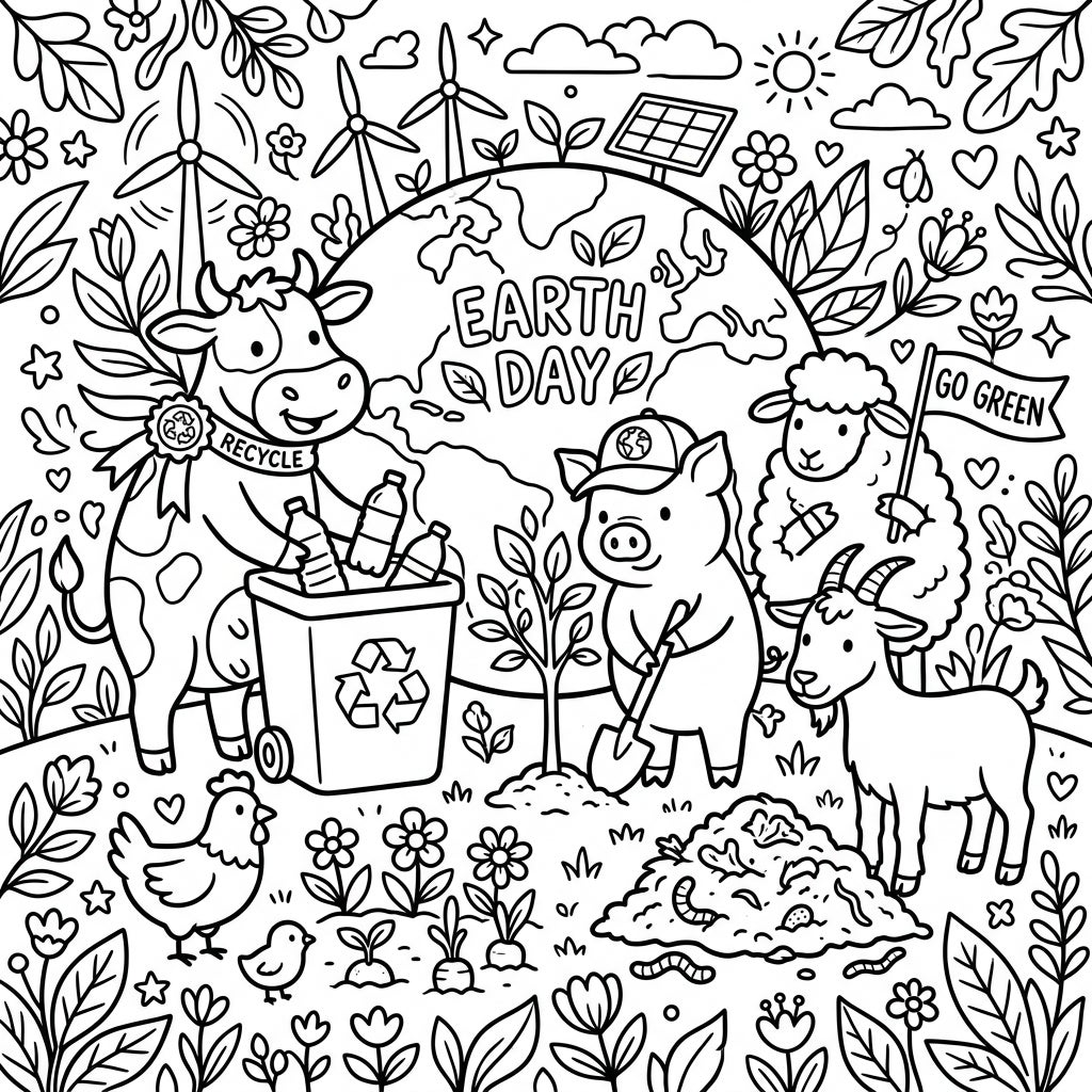 Join our adorable farm friends in celebrating Earth Day with this engaging coloring page. It's a delightful way to teach about recycling, planting, and caring for our planet.
