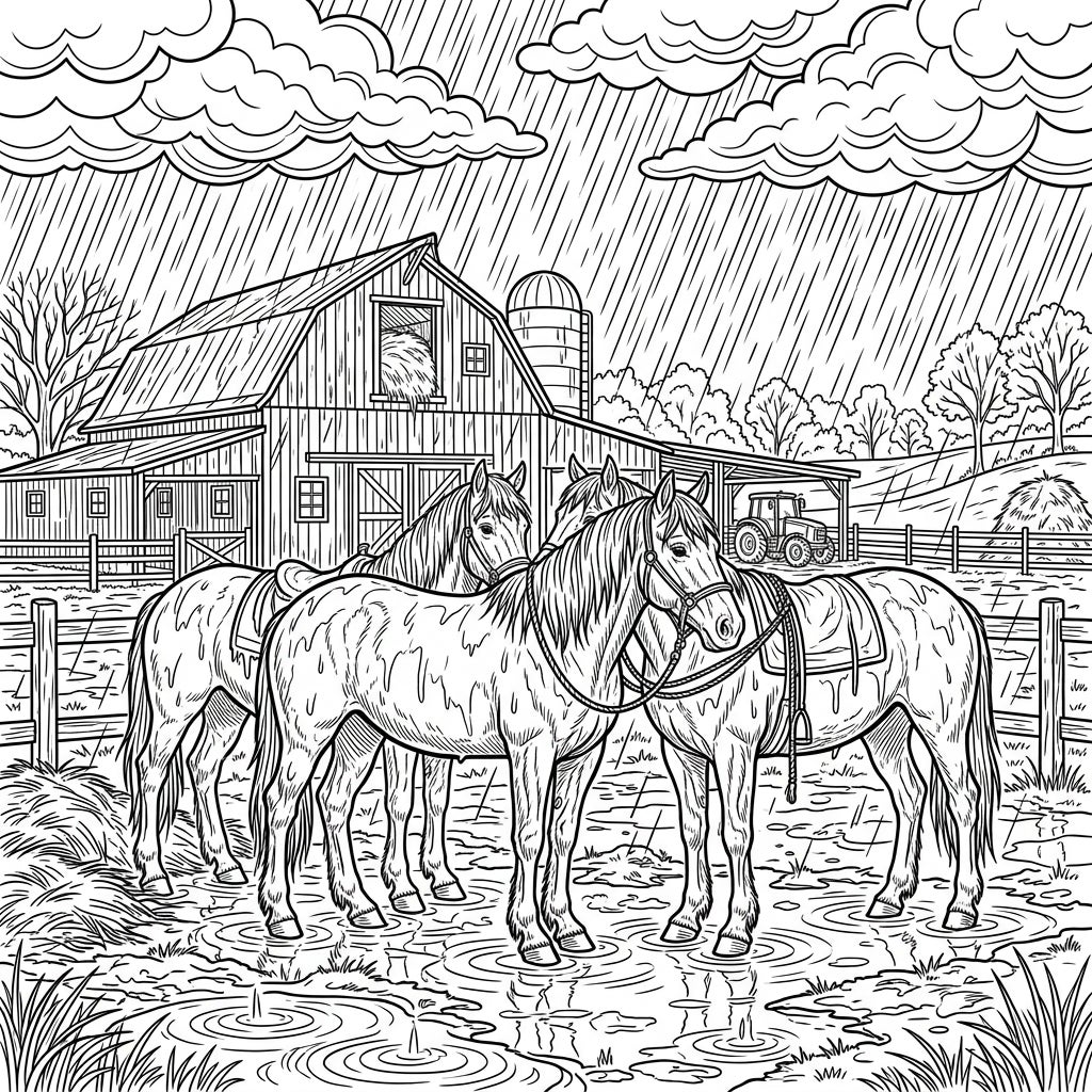 This intricate coloring page transports you to a serene farm scene amidst a gentle rain. Three majestic farm horses stand patiently in shimmering puddles, their coats detailed to show the rain falling upon them. In the background, a classic barn with a hayloft and a tall silo stand guard, while a sturdy tractor peeks out from under a shelter, completing this picturesque rural tableau. The entire landscape is beautifully rendered with atmospheric lines of rain cascading from the cloudy sky, creating a rich and immersive environment ready for your artistic touch.