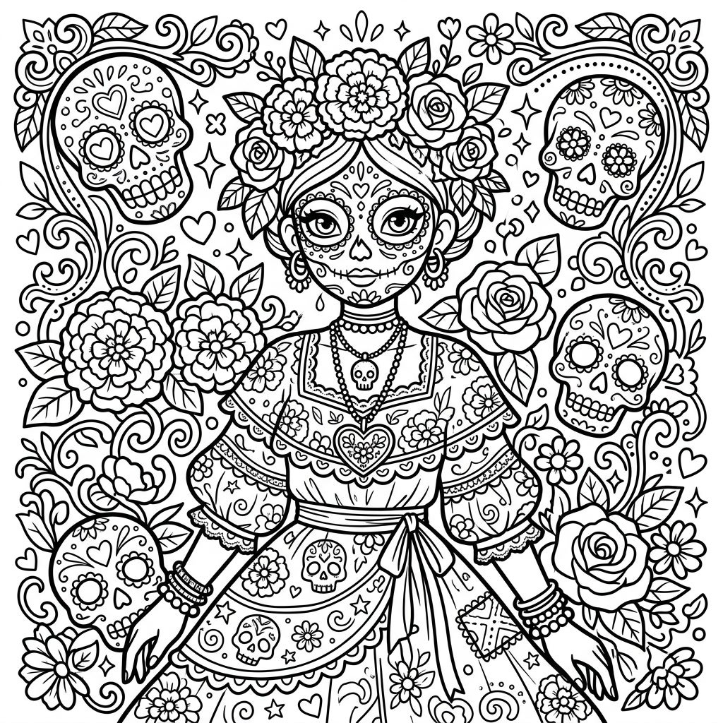 Immerse yourself in the vibrant spirit of Día de los Muertos with this exquisitely detailed Kawaii coloring page. At its heart is a charming figure, a sugar skull girl, adorned with traditional calavera face paint and an elaborate floral crown featuring roses and delicate blossoms. Her dress is a masterpiece of intricate patterns, showcasing elements of both fashion and beauty, from her elegant neckline to the flowing skirt adorned with smaller sugar skulls and geometric designs.