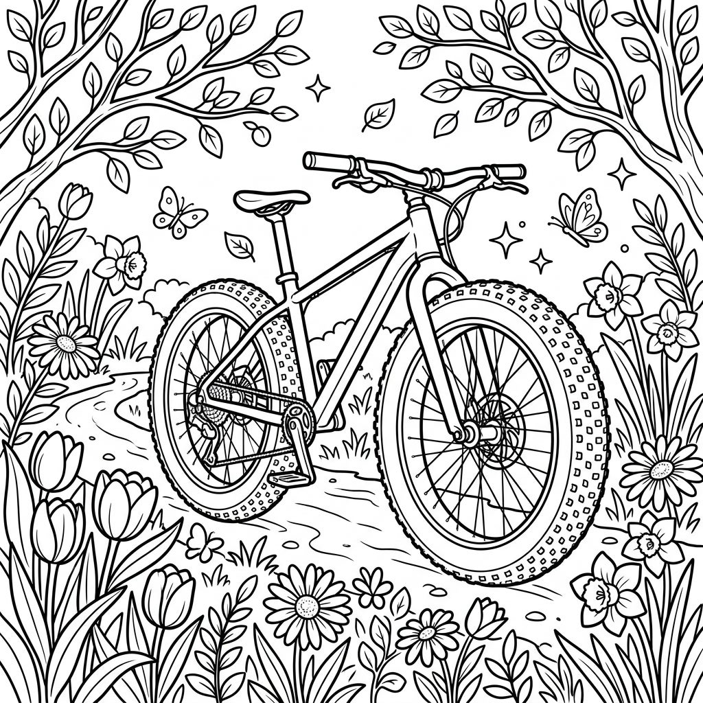 Embark on a creative journey with this vibrant fat bike coloring page, set amidst the fresh beauty of springtime. This design invites you to bring an exciting outdoor adventure to life with your favorite colors.