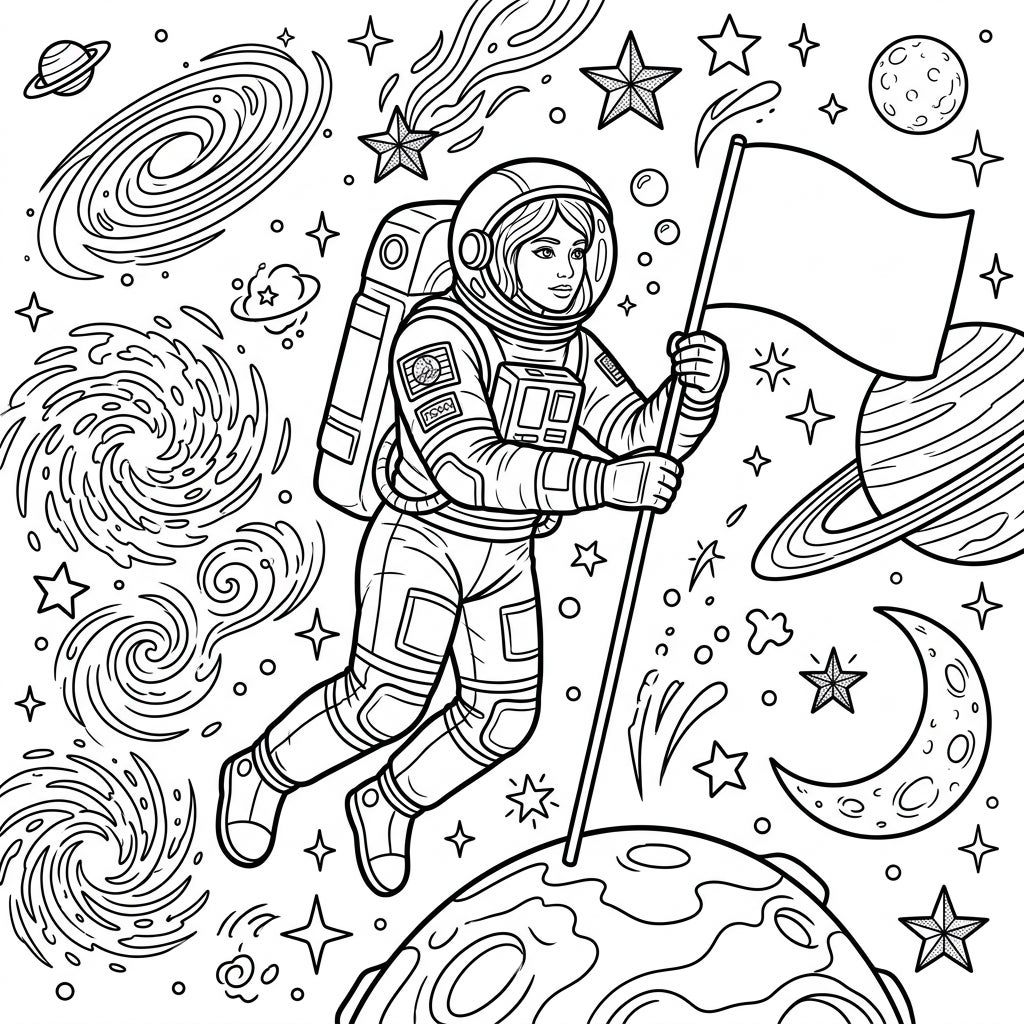 Embark on an inspiring artistic journey with our detailed coloring page, featuring a pioneering female astronaut. Dressed in her full spacesuit with intricate gear and helmet, she proudly holds a flag planted on the surface of a distant celestial body. The surrounding cosmos is a magnificent tapestry of swirling galaxies, brilliant stars, a cratered moon, and various planets, all rendered in clean, engaging line art perfect for coloring enthusiasts.