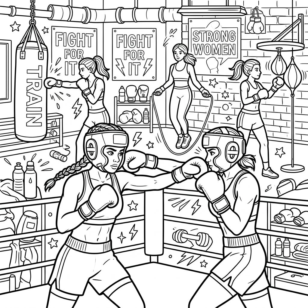 Dive into the empowering world of boxing with this action-packed coloring page designed for teens. Featuring strong female athletes training hard in a vibrant gym setting, it's perfect for celebrating strength and determination.