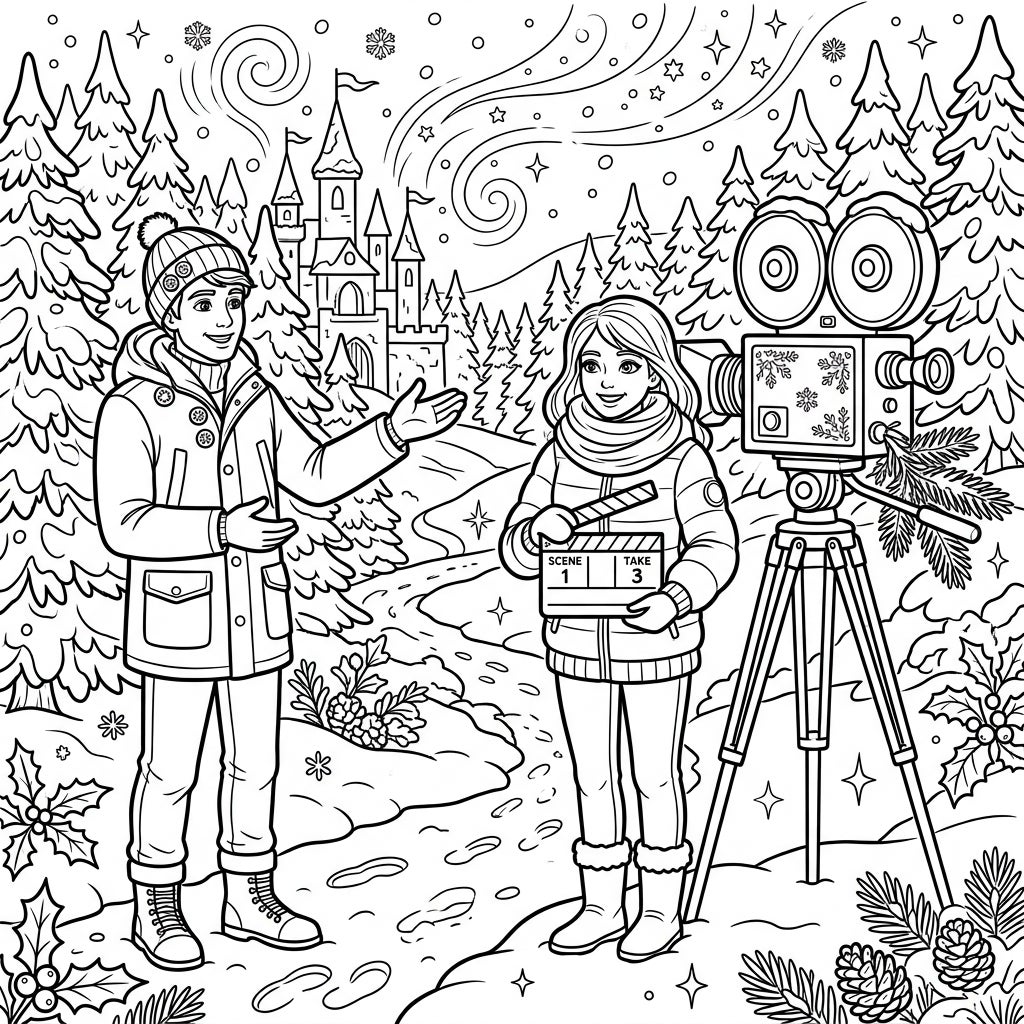 Unleash your artistic flair with this captivating coloring page, transporting you to a magical winter movie set. Two charming actors, bundled in cozy winter wear, stand ready to film. One gestures grandly towards a majestic, snow-kissed castle nestled amongst towering pine trees, while the other holds a classic clapperboard beside an old-fashioned film camera poised on a tripod. Delicate snowflakes drift down, dotting a winding path adorned with footprints, holly, and pinecones, creating an enchanting scene just waiting for your vibrant touch.