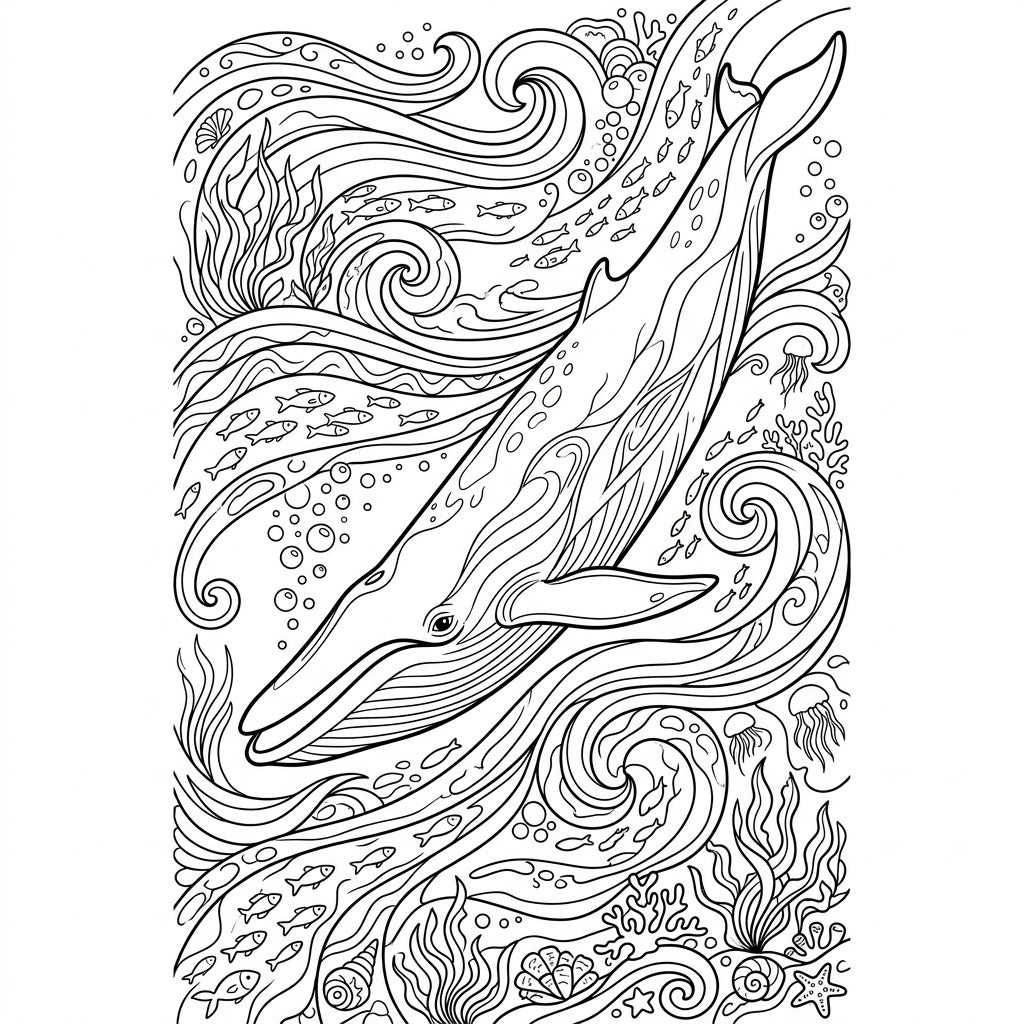 Unleash your artistic flair with a spectrum of blues, greens, and grays for the ocean, or let your imagination guide you with fantastical hues. Consider giving the fin whale its characteristic asymmetrical coloration with shades of grey on its right side and lighter tones on its left. Experiment with different textures for the waves and varying shades for the diverse marine plants and sea creatures to add depth and vibrancy to your unique underwater world.