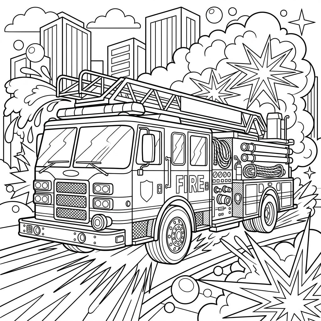 Rev up your crayons and markers for this thrilling Pop Art Fire Engine coloring page! This detailed illustration captures a powerful fire truck in full hero mode, complete with an extendable ladder, coiled hoses, and bold 'FIRE' lettering. The background bursts with energy, showcasing a vibrant cityscape, dynamic water splashes, and comic-style starbursts that truly bring the Pop Art aesthetic to life. Every element is rendered with thick, clean lines, making it easy and fun for young colorists to stay within the boundaries.