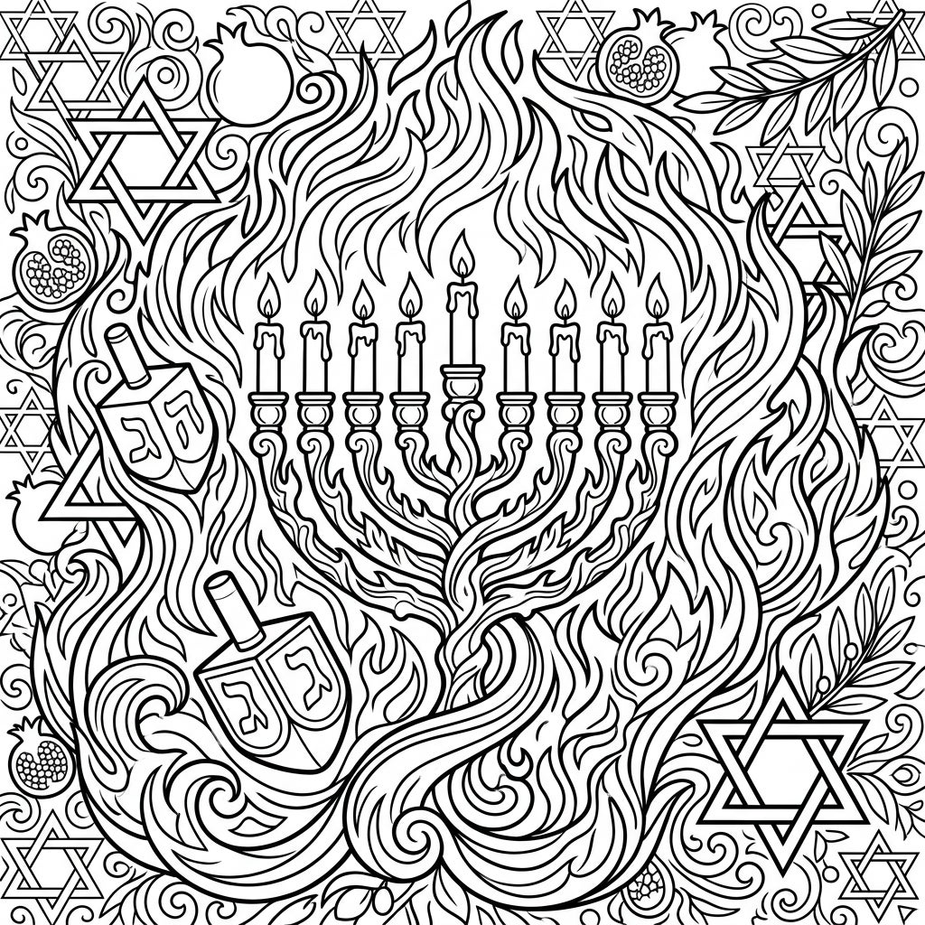 Celebrate the Festival of Lights with this dynamic Hanukkah coloring page, showcasing a beautifully rendered menorah engulfed in artistic flames. Alongside traditional dreidels and Stars of David, it promises an engaging and meaningful coloring experience.