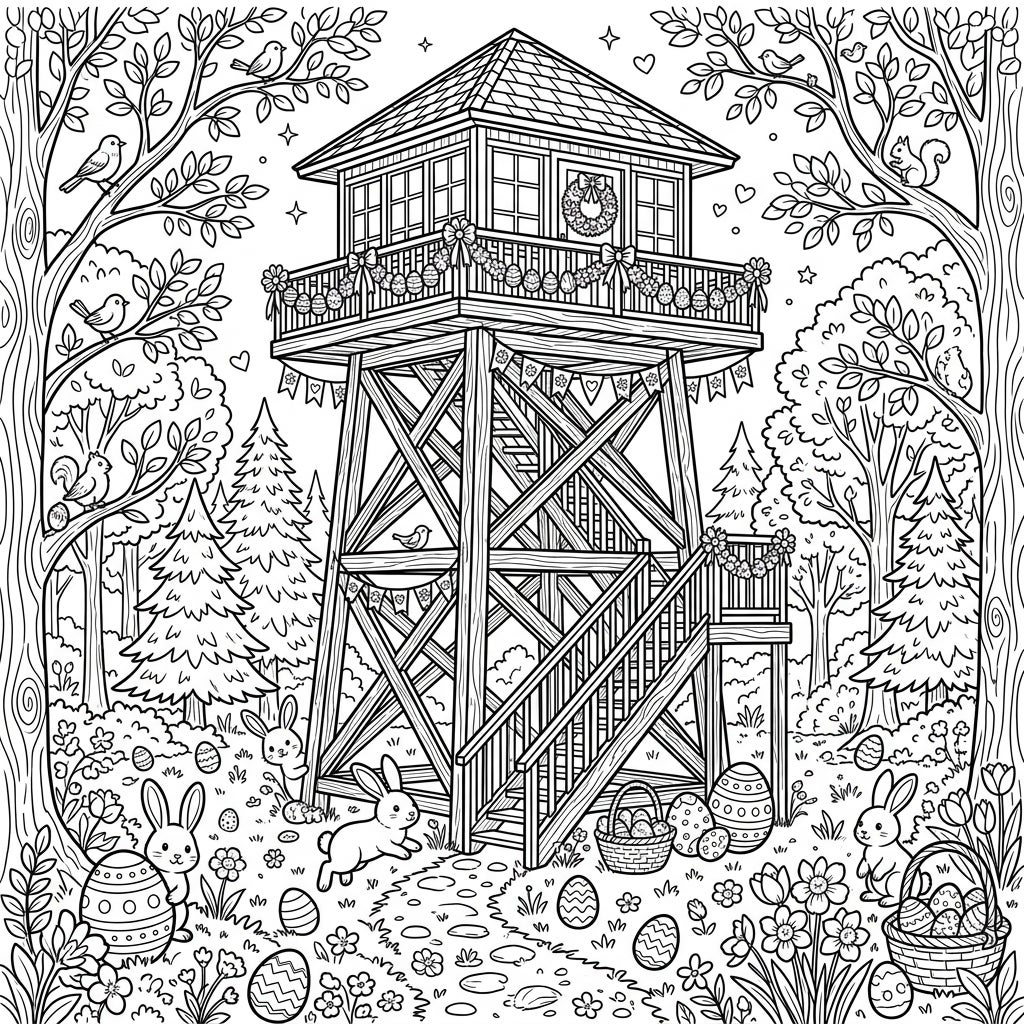 Welcome spring with an extraordinary coloring adventure featuring a majestic fire lookout tower adorned for Easter. Discover delightful bunnies, decorative eggs, and blooming flowers nestled within a lush forest setting.