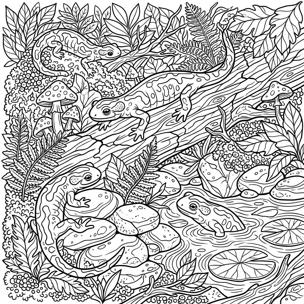 Step into a lush, vibrant ecosystem with this incredibly detailed Fire Salamander coloring page. The intricate scene features several majestic fire salamanders, their bodies gracefully resting on mossy logs and smooth river stones. Surrounding them is a rich tapestry of nature, including ancient tree roots, delicate ferns, whimsical mushrooms, and verdant foliage that fills every corner of the design. Look closely, and you'll even spot a curious frog peeking from the water, adorned with floating lily pads, adding another layer of life to this immersive forest tableau.