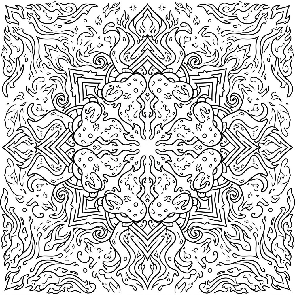Discover a truly unique coloring adventure with our Fire Slime Mandala. This intricate template showcases a mesmerizing radial design, where amorphous Fire Slime beings are meticulously patterned throughout. Each section of the mandala reveals swirling, flame-like forms and dotted textures, creating a highly geometric and detailed composition that promises hours of engaging coloring.