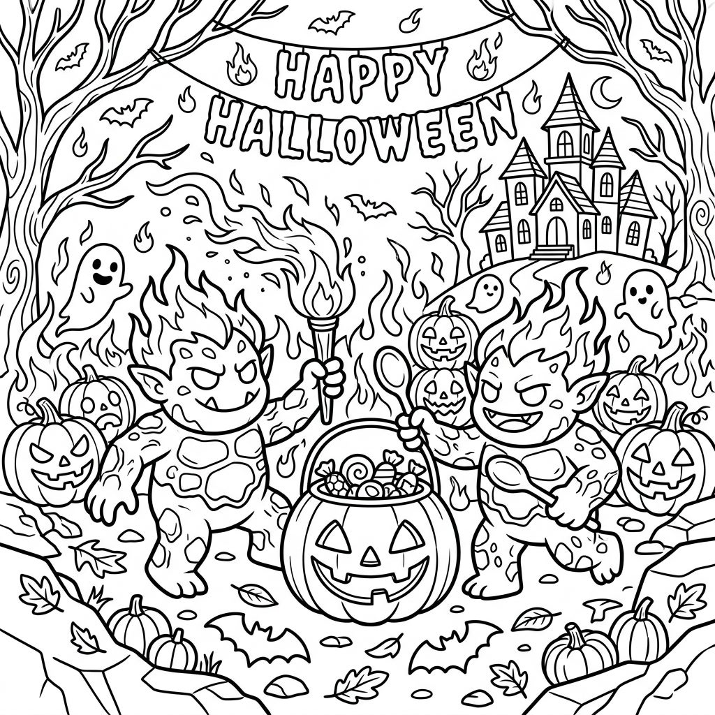 Dive into a thrilling Halloween adventure with our unique Fire Trolls coloring page. These fiery creatures are ready for trick-or-treating amidst spooky jack-o'-lanterns and friendly ghosts, promising hours of creative fun.