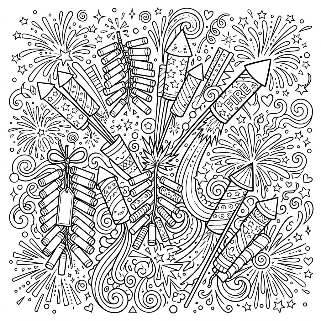 This captivating coloring page bursts with an energetic display of firecrackers and fireworks, intricately designed to provide a thrilling artistic experience. Discover an array of various rockets, some adorned with playful faces or distinct patterns, nestled amongst bundles of traditional firecrackers. The entire composition is a whirlwind of celebratory visuals, featuring swirling lines, twinkling stars, tiny hearts, and dynamic spark bursts that fill every corner, inviting you to explore and bring each element to life.