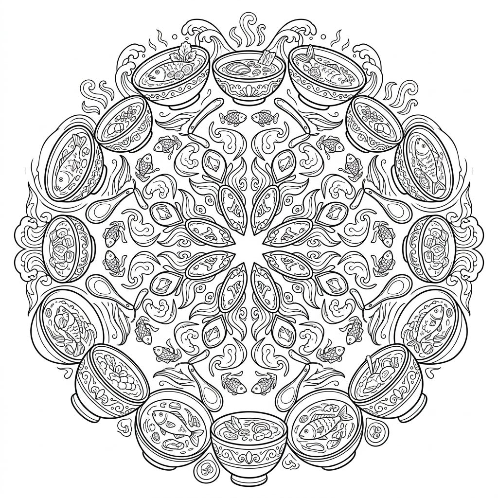 Explore the delightful fusion of culinary art and meditative design with this unique Fish Soup Mandala coloring page. Each intricate bowl and delicate fish detail invites you into a world of creative relaxation and gastronomic inspiration.
