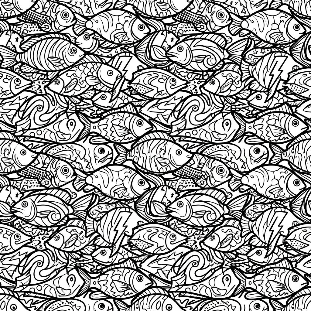 Dive into a kaleidoscope of creativity with our Pop Art Fish Tessellations coloring page. This intricate design showcases a seamless, dense pattern of various fish species, each expertly interlocked to form a captivating visual tapestry. True to the Pop Art style, you'll find bold, thick outlines defining each fin and scale, alongside exciting elements like halftone dot patterns, stylized waves, and even lightning bolt motifs that bring a dynamic, comic-book energy to the aquatic scene. The meticulous arrangement creates a continuous flow, inviting your eyes to explore every detailed segment.