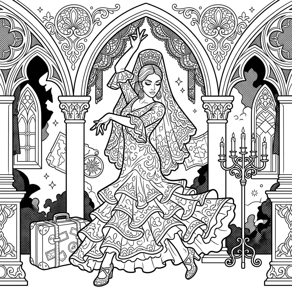 Experience the dramatic fusion of passionate Flamenco and mysterious Gothic charm with this intricate coloring page. Featuring a dancer amidst ornate architecture and travel motifs, it promises a uniquely engaging artistic escape.