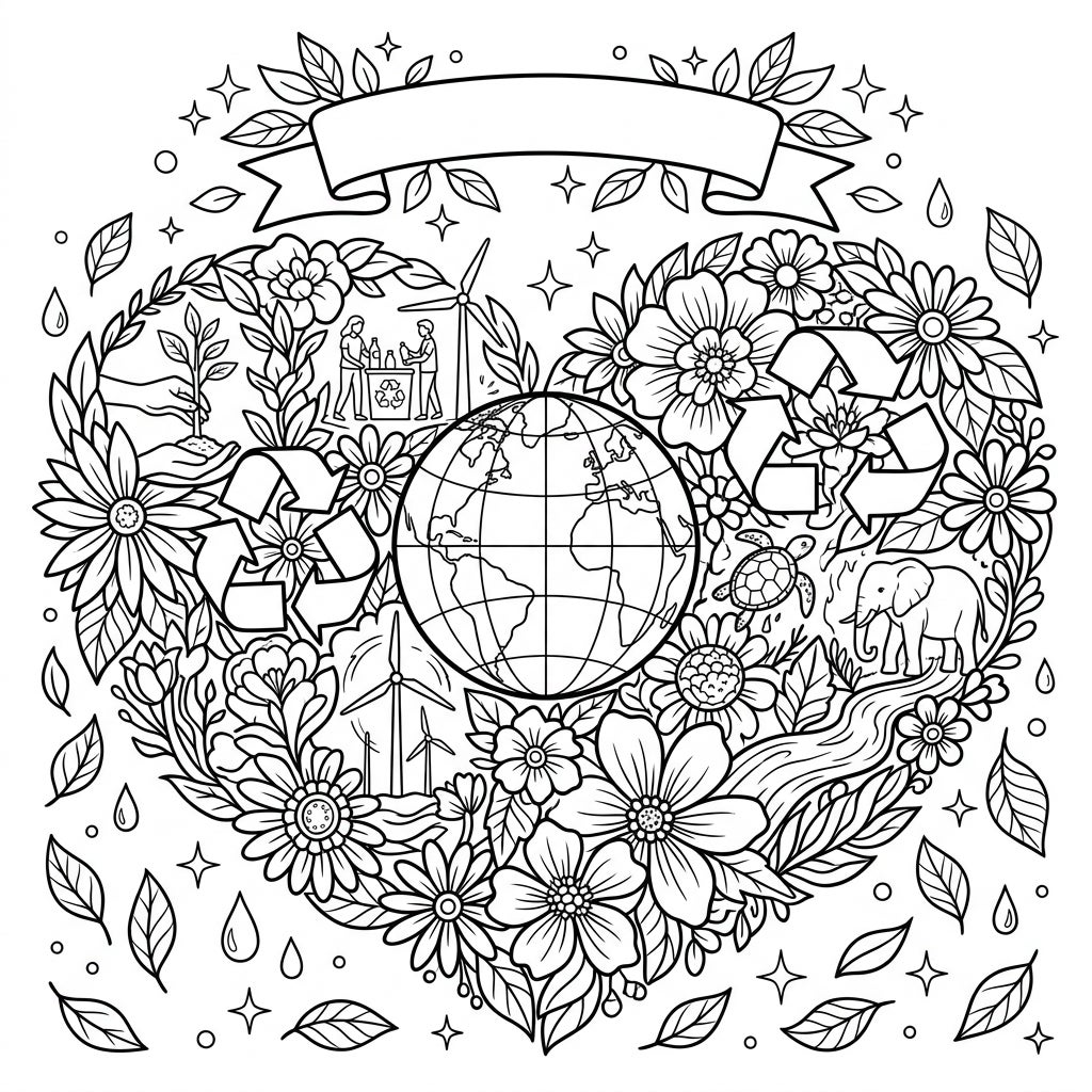This exquisite coloring template presents a large, intricate heart shape, masterfully crafted from a lush assembly of diverse blooming flowers and intertwining leaves. Within its delicate floral embrace, a world of environmental significance unfolds: a prominent globe takes center stage, flanked by iconic recycling symbols. Detailed scenes showcase wind turbines generating clean energy, individuals actively recycling, hands tenderly planting new life, and beloved wildlife like a graceful sea turtle and a majestic elephant, all nestled amidst a flowing river. A decorative blank banner unfurls at the top, ready for your personalized message, framed by sparkling stars and scattered leaves and water droplets that add a touch of natural charm to the entire composition.