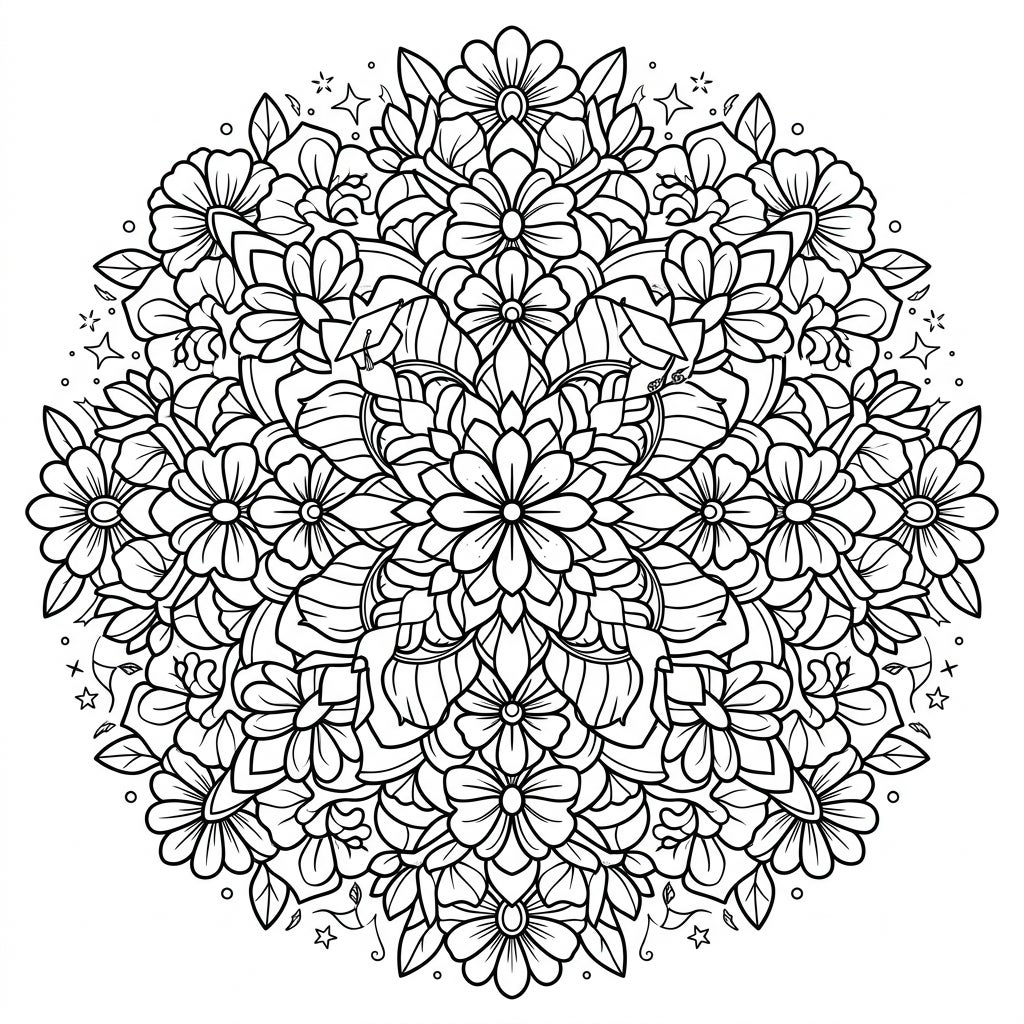 Dive into a world of intricate beauty with our Floral Graduation Mandala coloring page. This stunning, radially symmetrical design is a lush tapestry of delicate flowers, unfolding petals, and gracefully curving leaves, all meticulously rendered in pure line art. Every segment bursts with botanical detail, creating a harmonious and captivating visual experience that promises hours of focused coloring enjoyment.