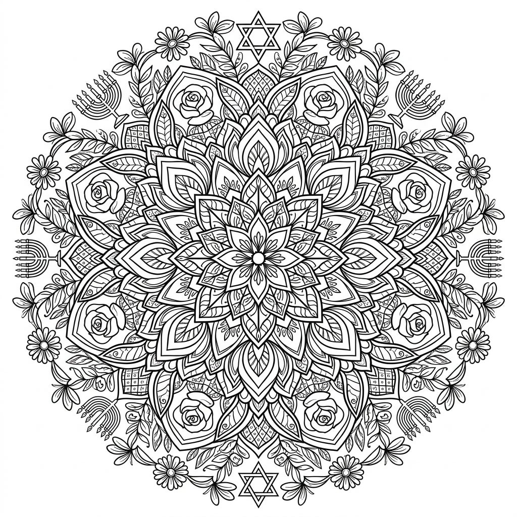 Dive into a world of intricate beauty with this stunning Floral Hanukkah Mandala coloring page. This design masterfully weaves together delicate botanical elements like blooming roses, graceful leaves, and charming small flowers, creating a visually rich tapestry. Look closely to discover beautifully integrated Hanukkah symbols, including elegant menorahs and Stars of David, all arranged in a captivating radially symmetrical pattern that invites exploration.