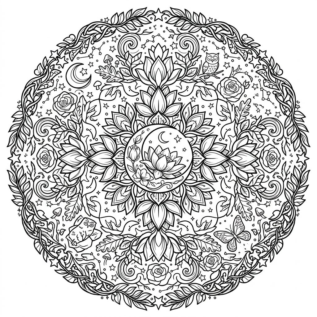 Beyond the botanical beauty, this mandala seamlessly integrates enchanting night-time elements, inviting you to explore a dreamlike nocturnal landscape. Tiny sparkling stars, delicate crescent moons, and subtle star constellations dot the design, evoking a sense of wonder and calm. Look closer to spot charming forest inhabitants like a wise owl perched on a branch, whimsical mushrooms, a graceful butterfly, and a hidden frog, adding layers of discovery and storytelling to your coloring journey. It's a perfect blend of natural elegance and mystical night charm.